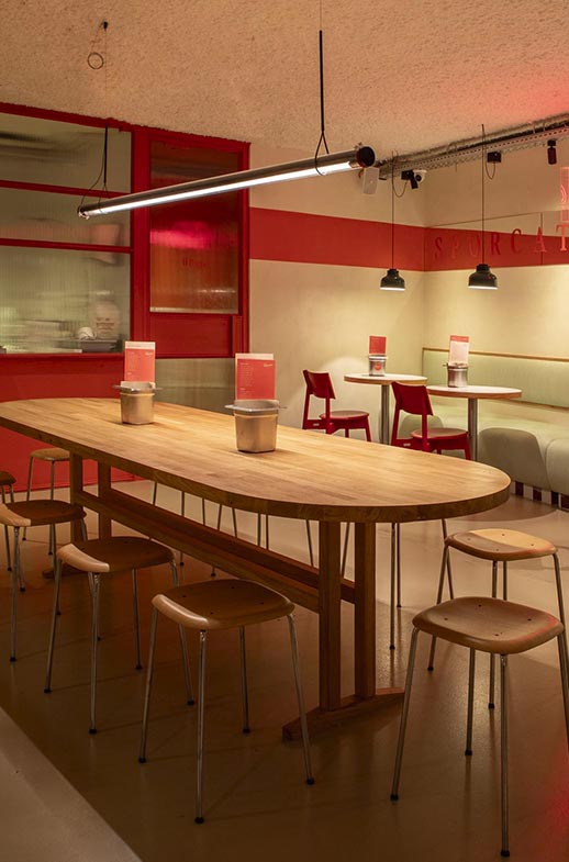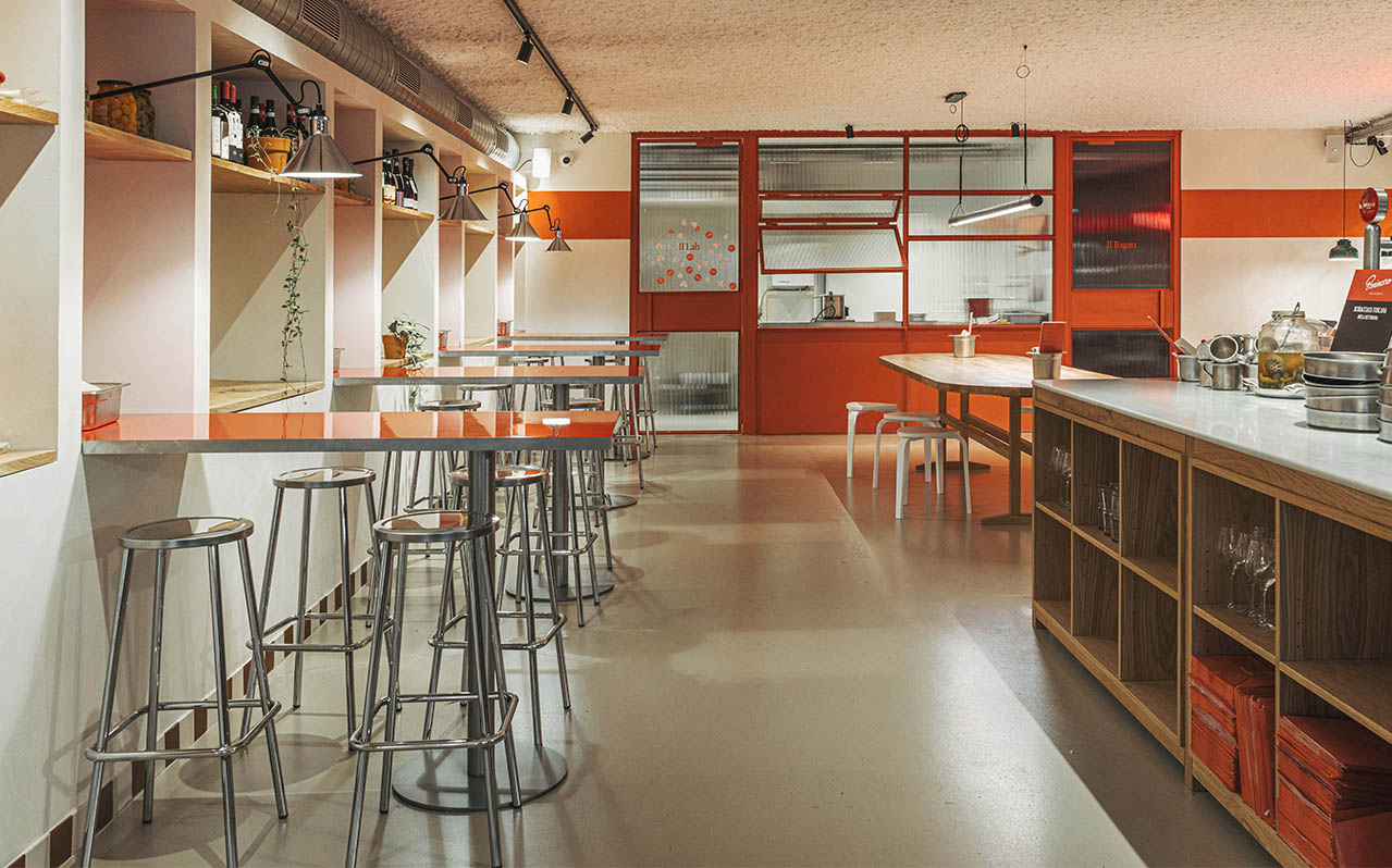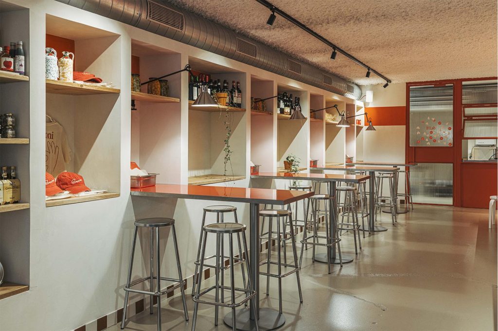 La focacceria se ha concebido para deleitar todos los sentidos, además de facilitar la interacción entre los comensales y el equipo culinario. Una cocina industrial abierta y una gran mesa grupal al centro del local promueven una atmósfera de comunidad.