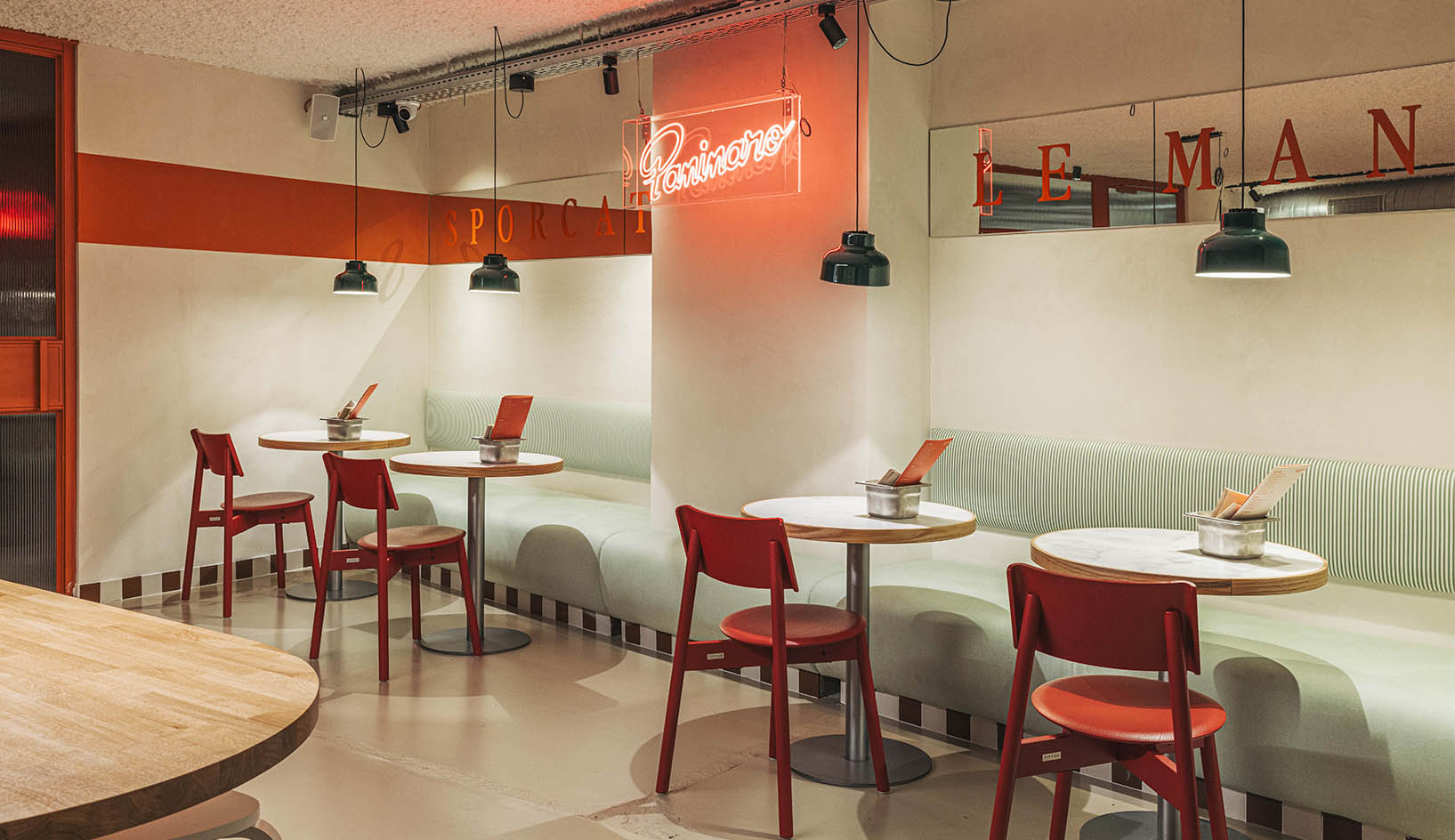 Por otro lado, un banco corrido tapizado con tela a rayas y las mesas de mármol brindan rincones más íntimos para quienes prefieren una experiencia tranquila.